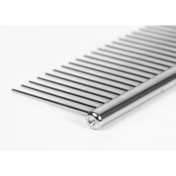 Een stevige, volledig metalen hondenkam met 3,2 cm lange, conische tanden die een combinatie zijn van fijn en grof.