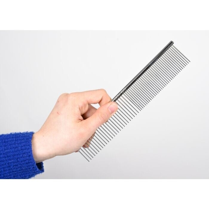 Een ander voordeel is dat je met deze niet-scherpe pinnen met afgeronde punt veilig kunt kammen zonder de hond pijn te doen. Omdat de tanden conisch zijn en iets fijner aan de punt, is het veel gemakkelijker om goed door en diep in elke vacht, zelfs dikkere, te geraken, en om dicht bij de huid te komen. De tanden zijn gemaakt van hoogwaardig, sterk en duurzaam staal met een gladde en dikke laag chroom, waardoor de kam gemakkelijk door de vacht glijdt.