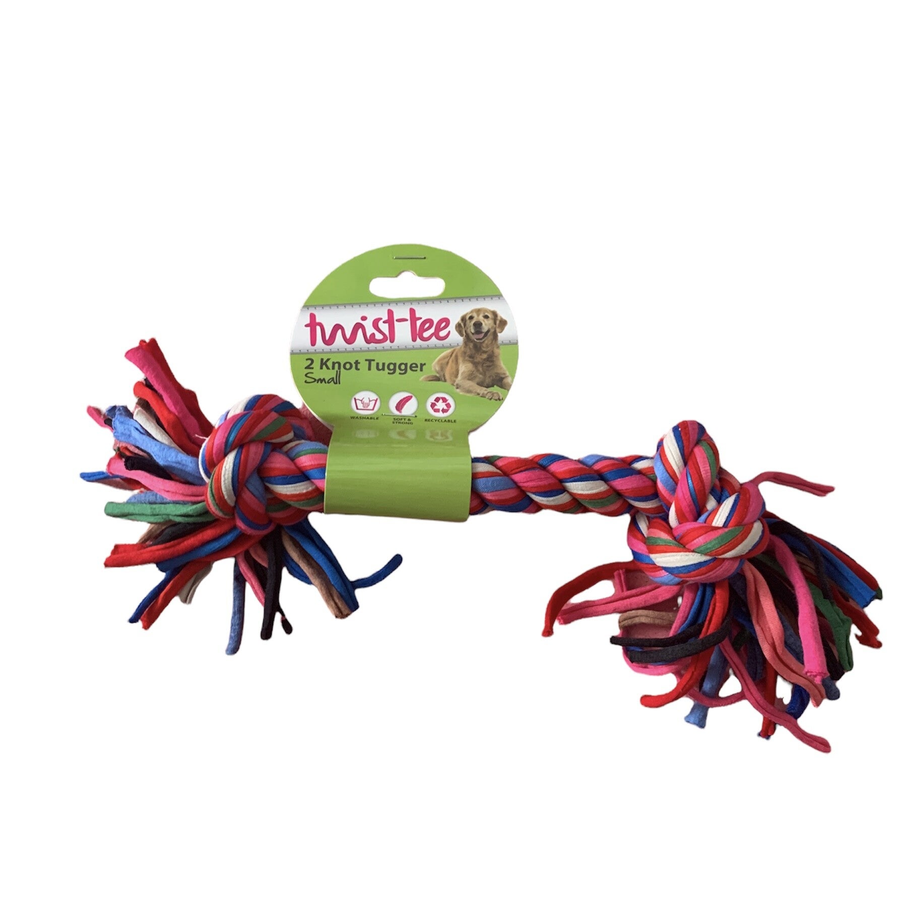 De Twist-Tee 2 Knoop Tugger is leuk hondenspeelgoed gemaakt van gerecyclede t-shirts, zonder flostouw, om veilig mee te spelen.